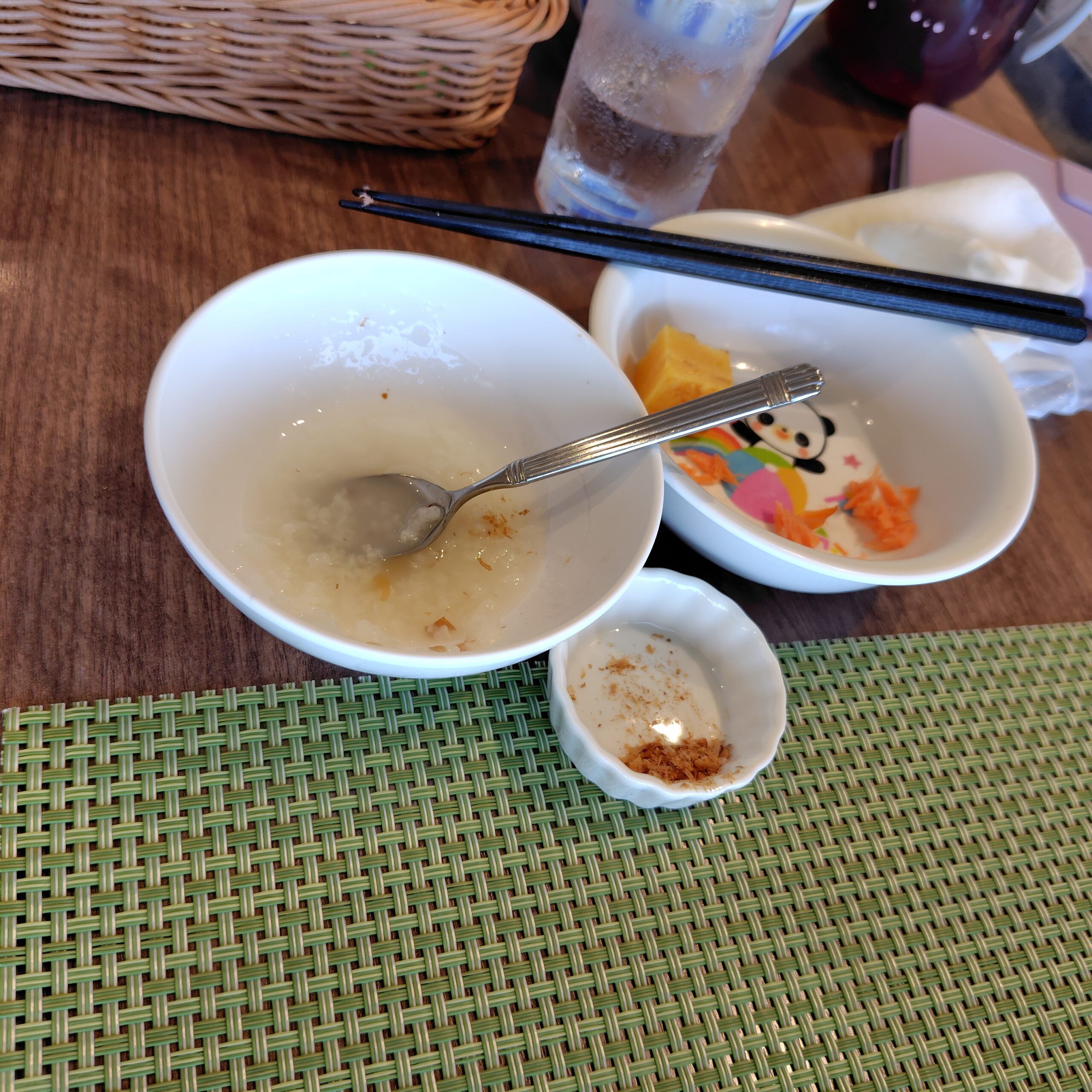 子供の食事は頼んでいなかったのですが、子供用のおかゆご飯も用意してくださいました(食べる前の写真を撮り忘れました。)。おかずは大人のものをおすそ分けしましたが一緒に食べれてよかったです。
